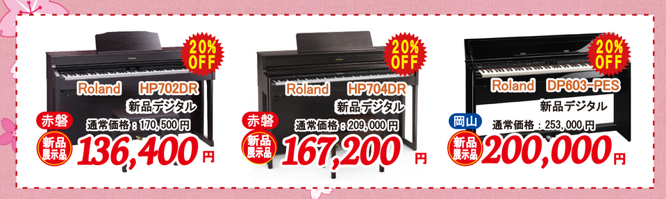 ローランド、ヤマハの展示品を現品特価でご案内しております。