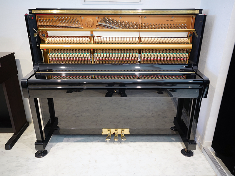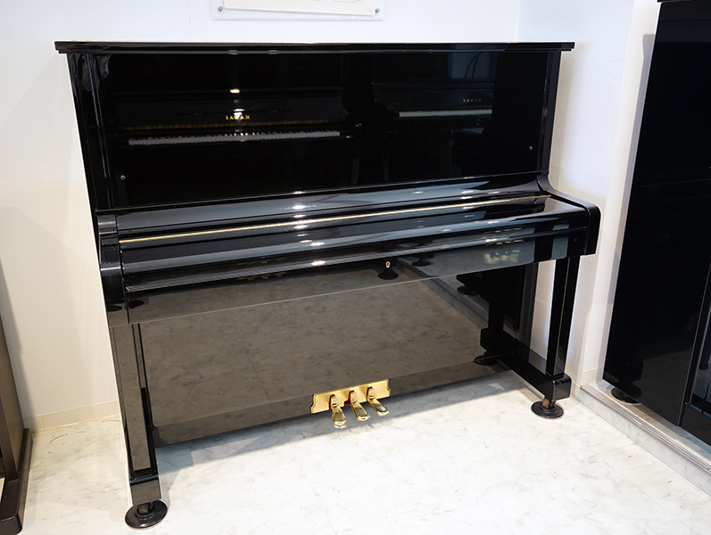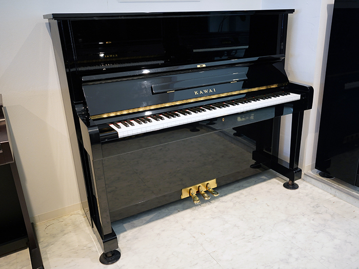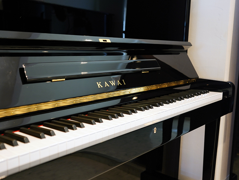 カワイの特別限定モデルのアップライトピアノ。背の高さが125㎝で前側に脚のついたピアノです。ハンマーは高音部を除いてアンダーフェルトが入っており、カワイ独特の優しい柔らかい音のなかにもしっかりとした真のある音が楽しめます。また、ピアノの上蓋を開けることのできるトップサポートも付いています。ペダルのところに金属パネルがついております。